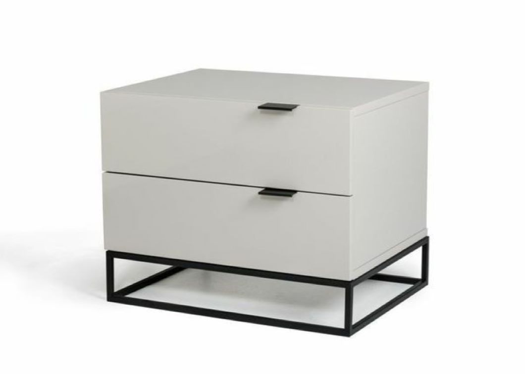 White bedside drawer with two drawers and a black stand.