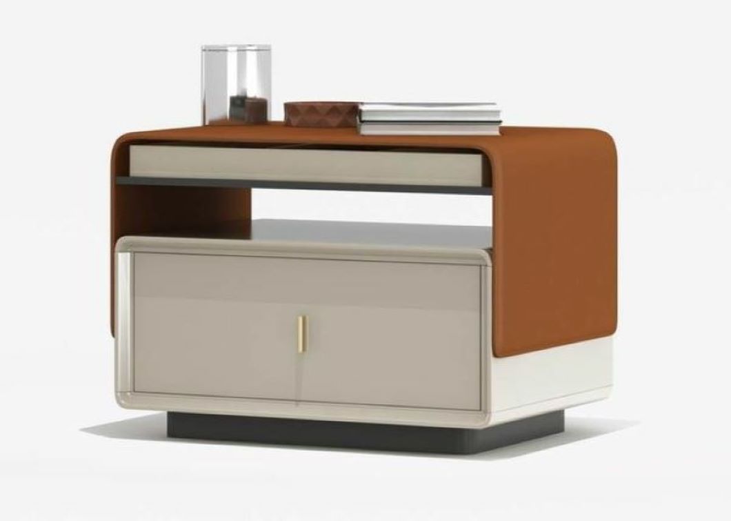 Renna Homes Design creates stylish edgy furnitures with quality finishing without compromising storage like this white and brown wooden bedside drawer with a single drawers.
