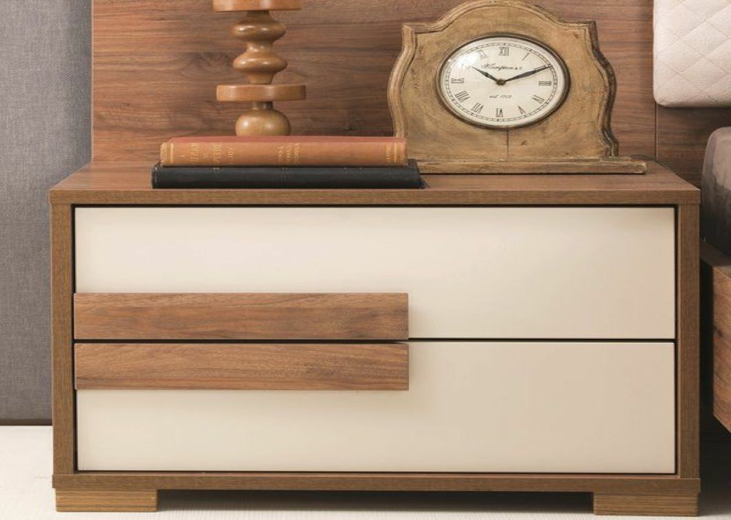 Beige and brown wooden bedside drawer with double drawers.