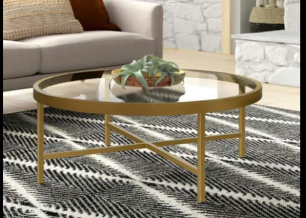 A round shaped center table with a glass top and gold plated stand
