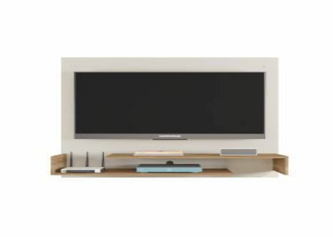 Brown wooden television console with a white back drop for holding the television and a single wide compartment.