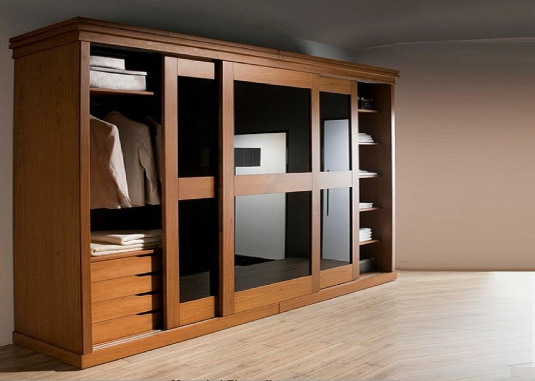 All brown wooden enclosed Wardrobe with a reflective glass cover